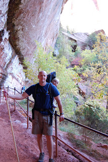 Kymbell in her pack riding the bus up into Zion Park. She loves her pack so much she didn't want to get out of it.